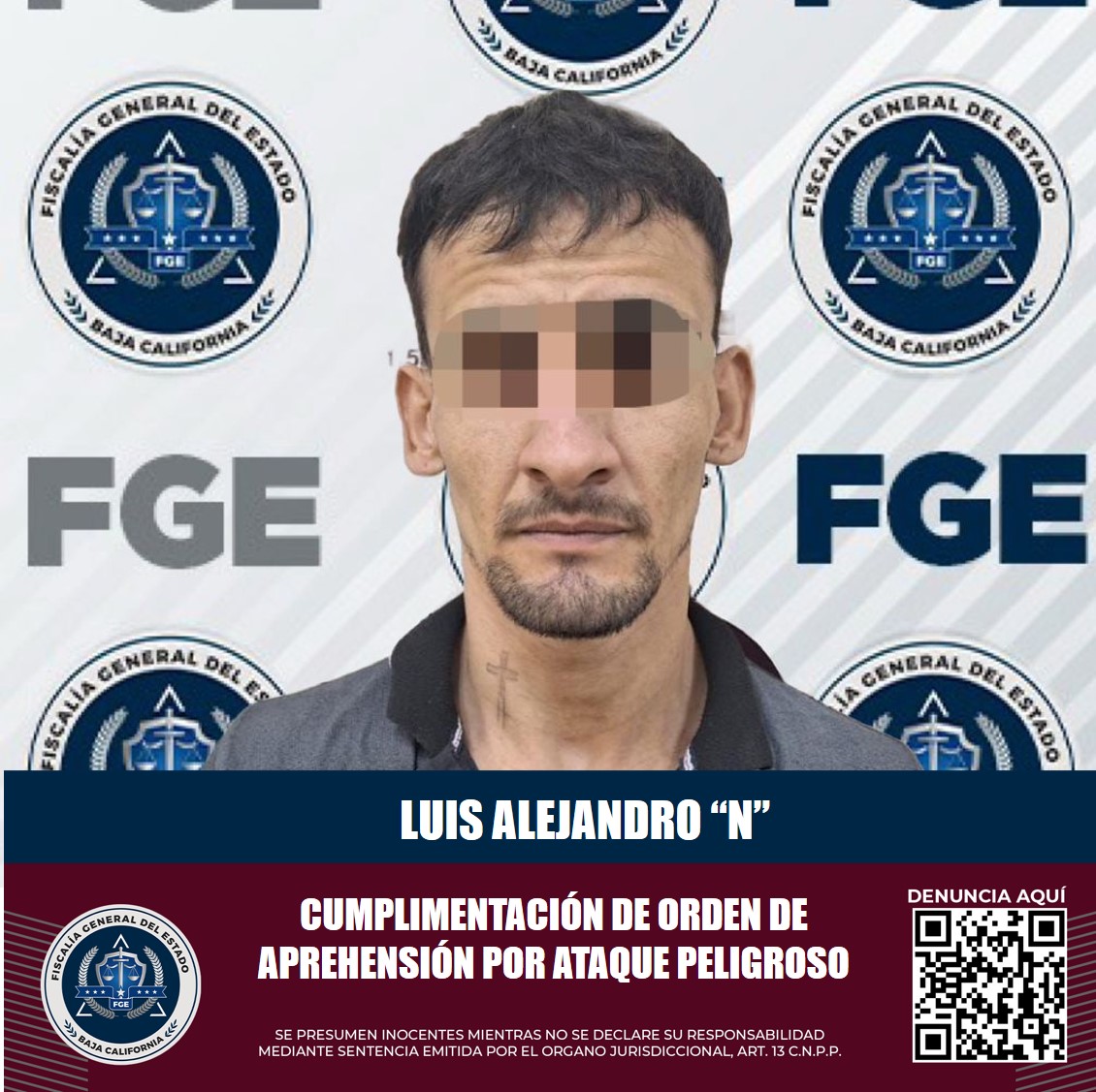 MEXICALI, B.C. La Fiscalía Regional de Mexicali, a través del trabajo realizado por agentes estatales de investigación, logró que se cumplimentara una orden de aprehensión en contra de Luis Alejandro “N”, por presuntamente cometer el delito de ataque peligroso.