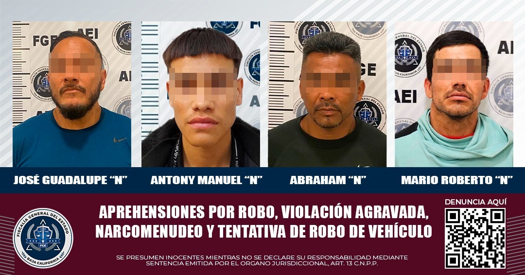 TIJUANA, B.C. La Fiscalía General del Estado, a través de la Agencia Estatal de Investigación, ha llevado a cabo la ejecución de cuatro órdenes de aprehensión emitidas por jueces de control, contra individuos acusados de diferentes delitos.