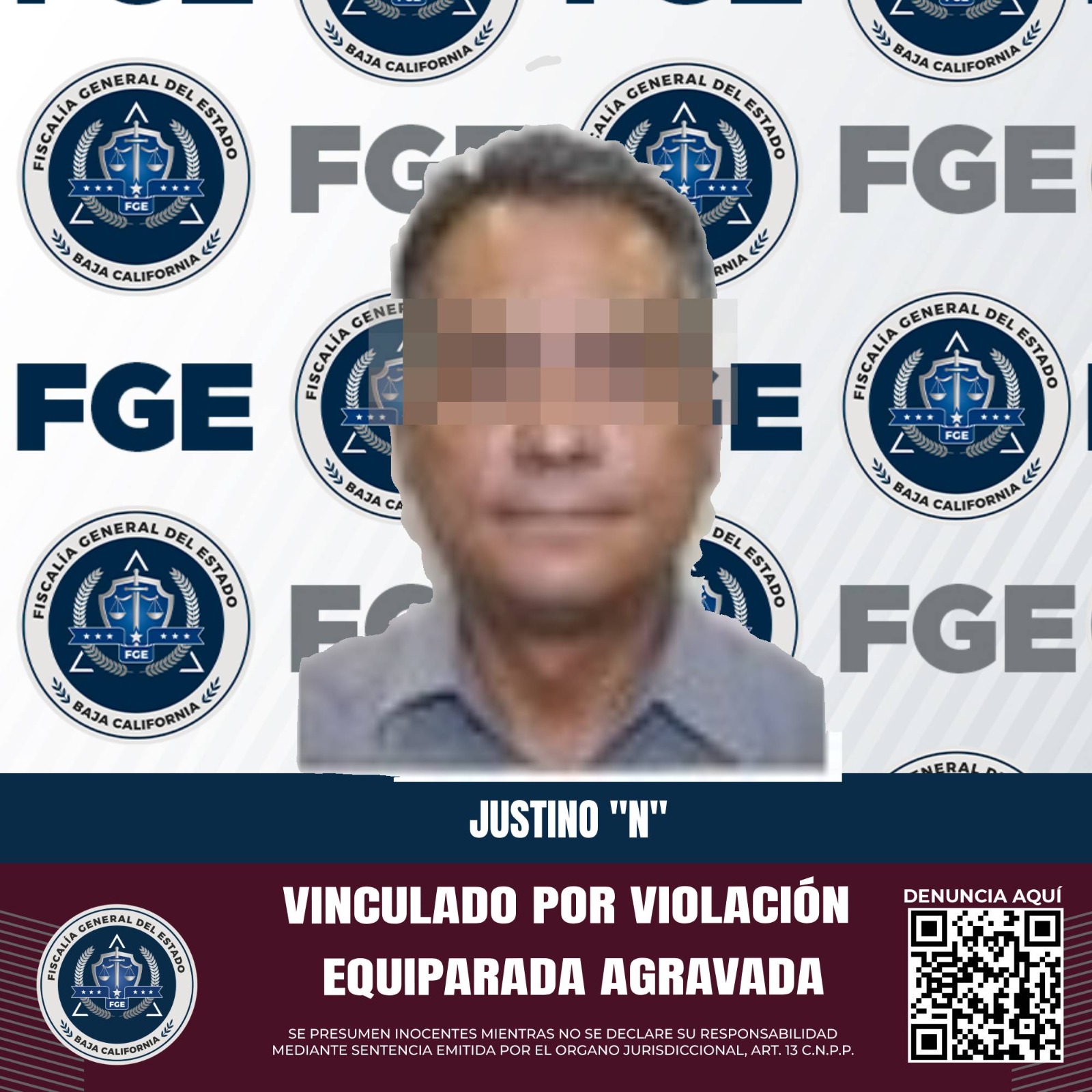MEXICALI, B.C. Por la presunta responsabilidad de Justino Alberto “N” en el delito de violación equiparada, en agravio de una menor de once años, la Fiscalía General del Estado, a través de la Fiscalía Especializada en Delitos Contra Mujeres por Razón de Género, logró el inicio del proceso penal en su contra.