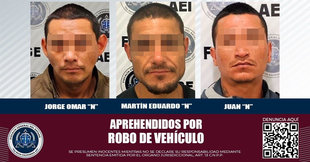 TIJUANA, B.C. En diligencias realizadas por elementos de la Fiscalía General del Estado, a través de la Agencia Estatal de Investigación (AEI), se logró la cumplimentación de tres órdenes de aprehensión, en contra de igual número de personas, que son investigadas, en casos por separado, por robo de vehículo.
