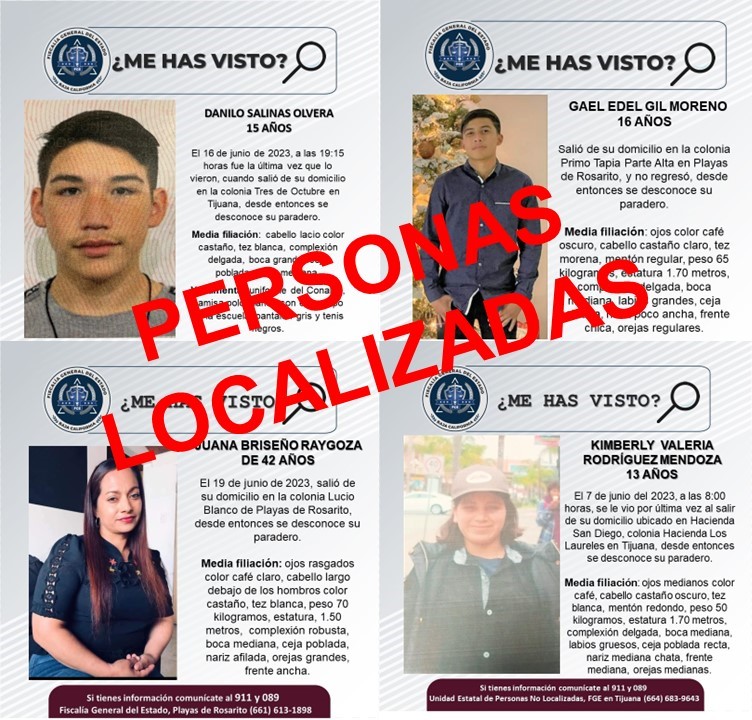 Las personas localizadas son: Danilo Salinas Olvera de 15 años; Juana Briseño Raygoza de 42 años; Kimberly Valeria Rodríguez Mendoza de 13 años, y Gael Edel Gil Moreno de 16 años de edad.