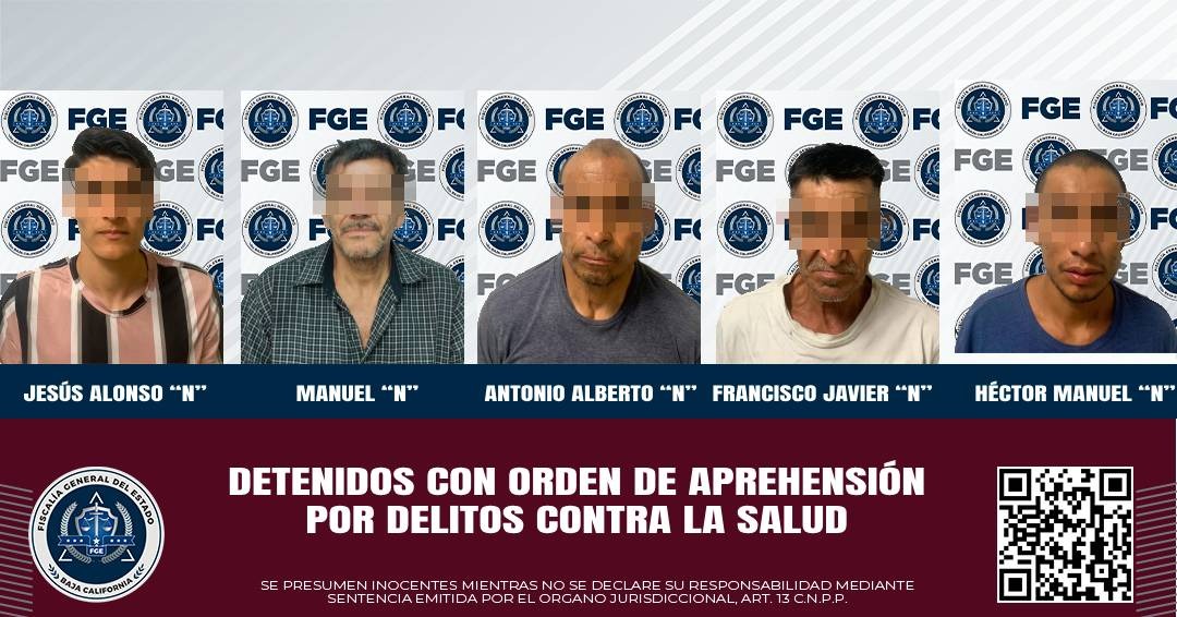 MEXICALI, B.C. Como parte del combate frontal a la venta de droga, la Fiscalía General del Estado (FGE), a través de elementos de la Agencia Estatal de Investigación (AEI), detuvo a cinco personas que tenían orden de aprehensión por delitos contra la salud en la modalidad de narcomenudeo, en la variante de posesión simple del psicotrópico denominado metanfetamina.