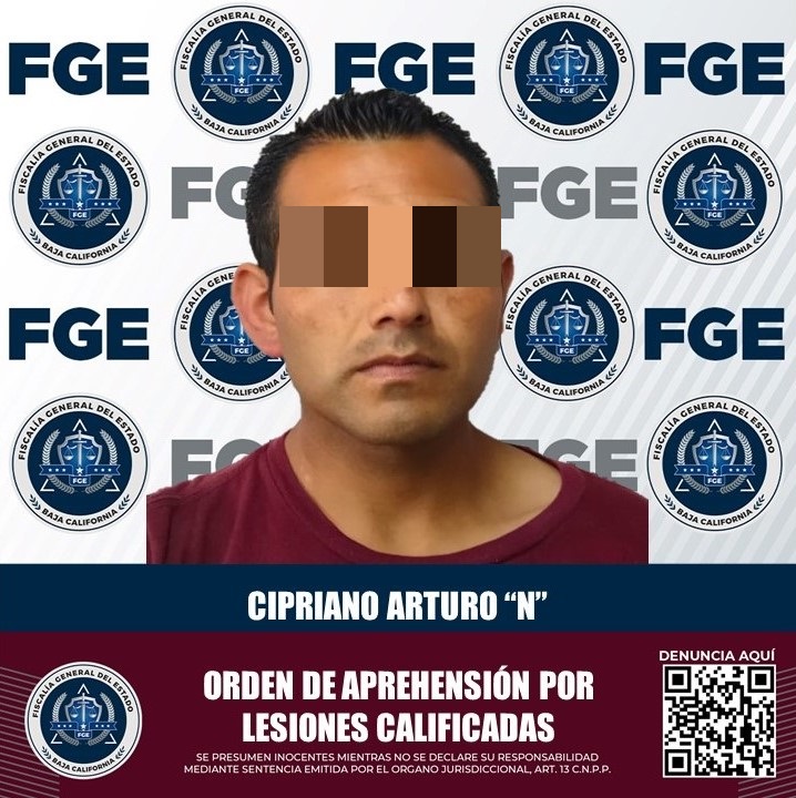 ENSENADA, B.C. La Fiscalía General del Estado cumplimentó orden de aprehensión por el delito de lesiones calificadas, en contra de un hombre identificado como Cipriano Arturo “N”, de 34 años de edad.