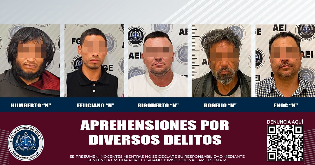 TIJUANA, B.C. La Fiscalía General del Estado informa que se han logrado cinco nuevas aprehensiones gracias al trabajo realizado por los detectives de la Agencia Estatal de Investigación (AEI).