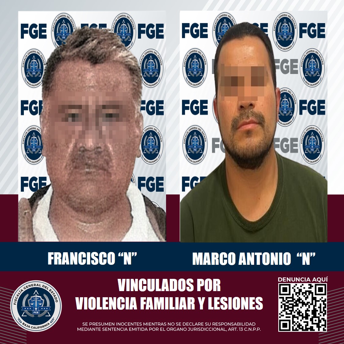 TIJUANA, B.C. La Fiscalía General del Estado, a través de la Fiscalía Especializada en Delitos Contra Mujeres por Razón de Género, obtuvo la vinculación a proceso de dos sujetos acusados de violencia familiar en audiencias por separado.
