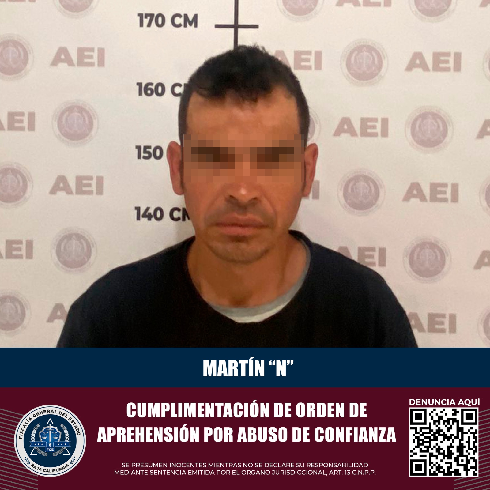 PLAYAS DE ROSARITO, B.C. Por su presunta responsabilidad en el delito de abuso de confianza, un hombre fue aprehendido por agentes de la Fiscalía General del Estado, a fin de que responda ante la justicia por el ilícito que se le imputa.