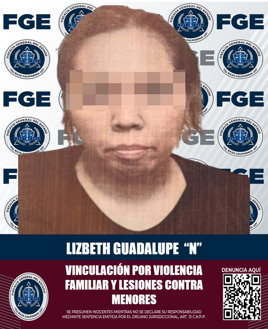 TIJUANA, B.C. La Fiscalía General del Estado, a través del agente del Ministerio Público de la Fiscalía Especializada en Delitos Contra Mujeres por Razón de Género, obtuvo la vinculación a proceso de Lizbeth Guadalupe “N”, acusada de los delitos de violencia familiar física y psicológica, así como lesiones contra menores.