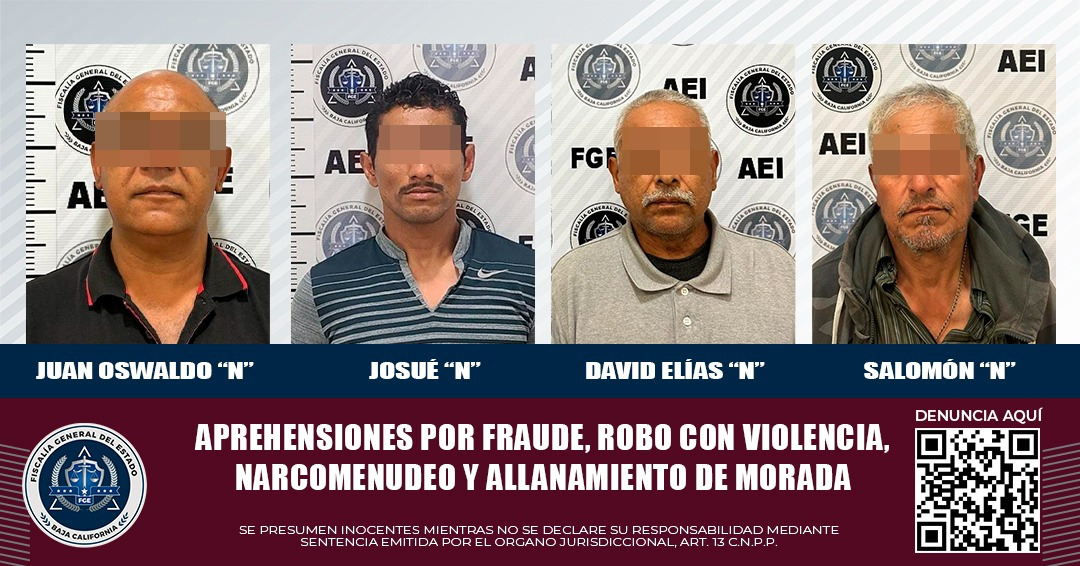 TIJUANA, B.C. La Fiscalía General de Baja California, a través de su corporación policial, ha logrado la aprehensión de cuatro individuos que se encontraban prófugos de la justicia por diferentes delitos. Estos sujetos contaban con mandatos judiciales en su contra por los delitos de fraude, narcomenudeo, robo con violencia y allanamiento de morada. Los detenidos han sido puestos a disposición de la autoridad jurisdiccional correspondiente.