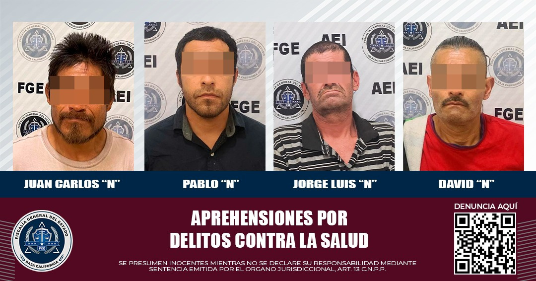 TIJUANA, B.C. La Unidad de Aprehensiones de la Fiscalía General del Estado ha logrado la detención de cuatro individuos que se encontraban prófugos de la justicia. Estas detenciones se llevaron a cabo como parte de la estrategia de combate al narcomenudeo; los individuos contaban con mandatos judiciales en su contra por delitos contra la salud en la modalidad de narcomenudeo.
