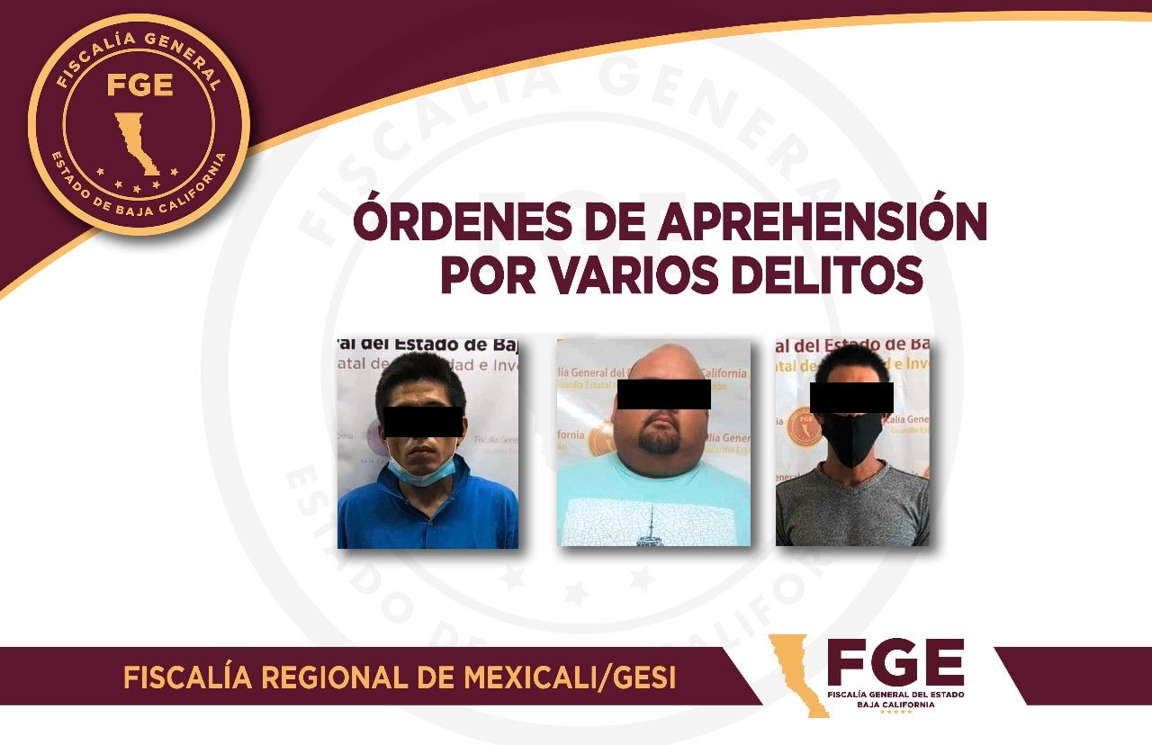 MEXICALI, BAJA CALIFORNIA A 13 DE SEPTIEMBRE DE 2020.- La Fiscalía General del Estado cumplimentó órdenes de aprehensión en contra de tres hombres buscados por los delitos de robo con violencia, contra la salud en su modalidad de narcomenudeo daño en propiedad ajena y lesiones por culpa, respectivamente.