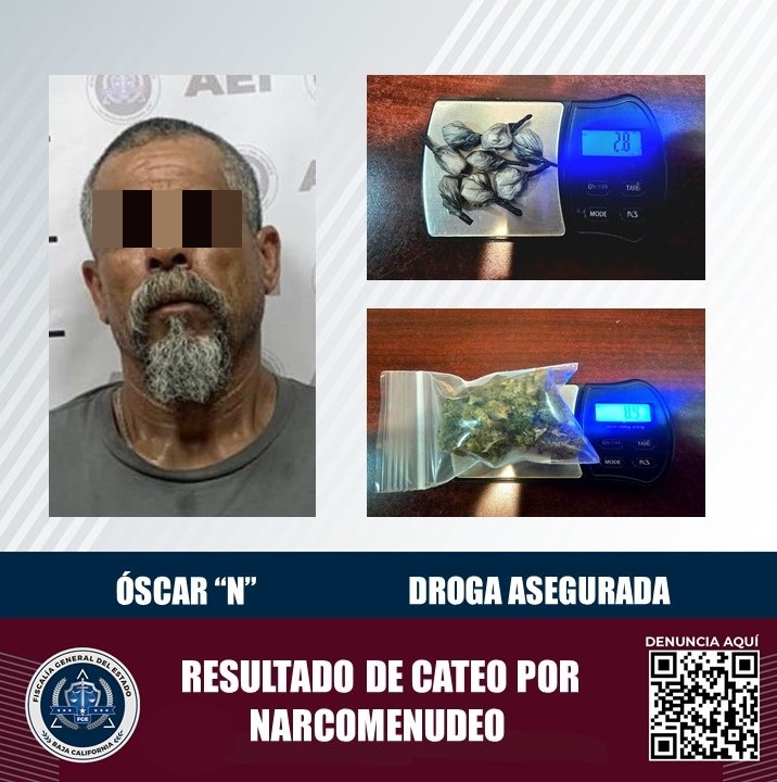 ENSENADA, B.C. La Fiscalía General del Estado aseguró a un presunto narcomenudista, droga y un domicilio, como resultado de un cateo en el municipio de Ensenada.