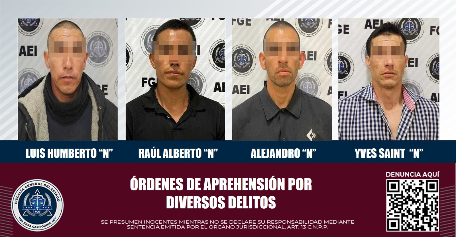 TIJUANA, B.C. La Fiscalía General del Estado cumplimentó, a través de la Unidad de Aprehensiones de la Agencia Estatal de Investigación, cuatro mandatos judiciales, por los delitos de lesiones, robo calificado, robo de vehículo y tentativa de homicidio.