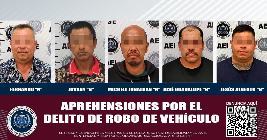 TIJUANA, B.C. Cinco hombres que contaban con mandamiento judicial activo por el delito de robo de vehículo, en casos por separado, fueron aprehendidos por elementos de la Fiscalía General del Estado, a través de la Agencia Estatal de Investigación (AEI).
