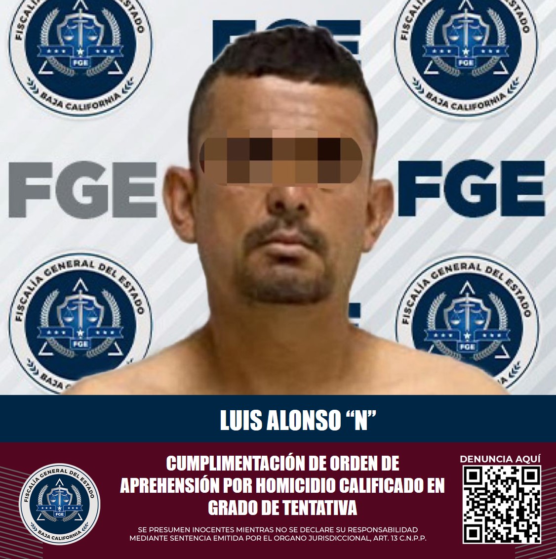 MEXICALI, B.C. Como resultado del trabajo realizado por la Fiscalía Especializada en Delitos Contra la Vida y por el Grupo Especializado en Aprehensiones de la Fiscalía General del Estado, se cumplimentó un mandato judicial en contra de Luis Alonso “N”, por el delito de homicidio calificado por ventaja en grado de tentativa.