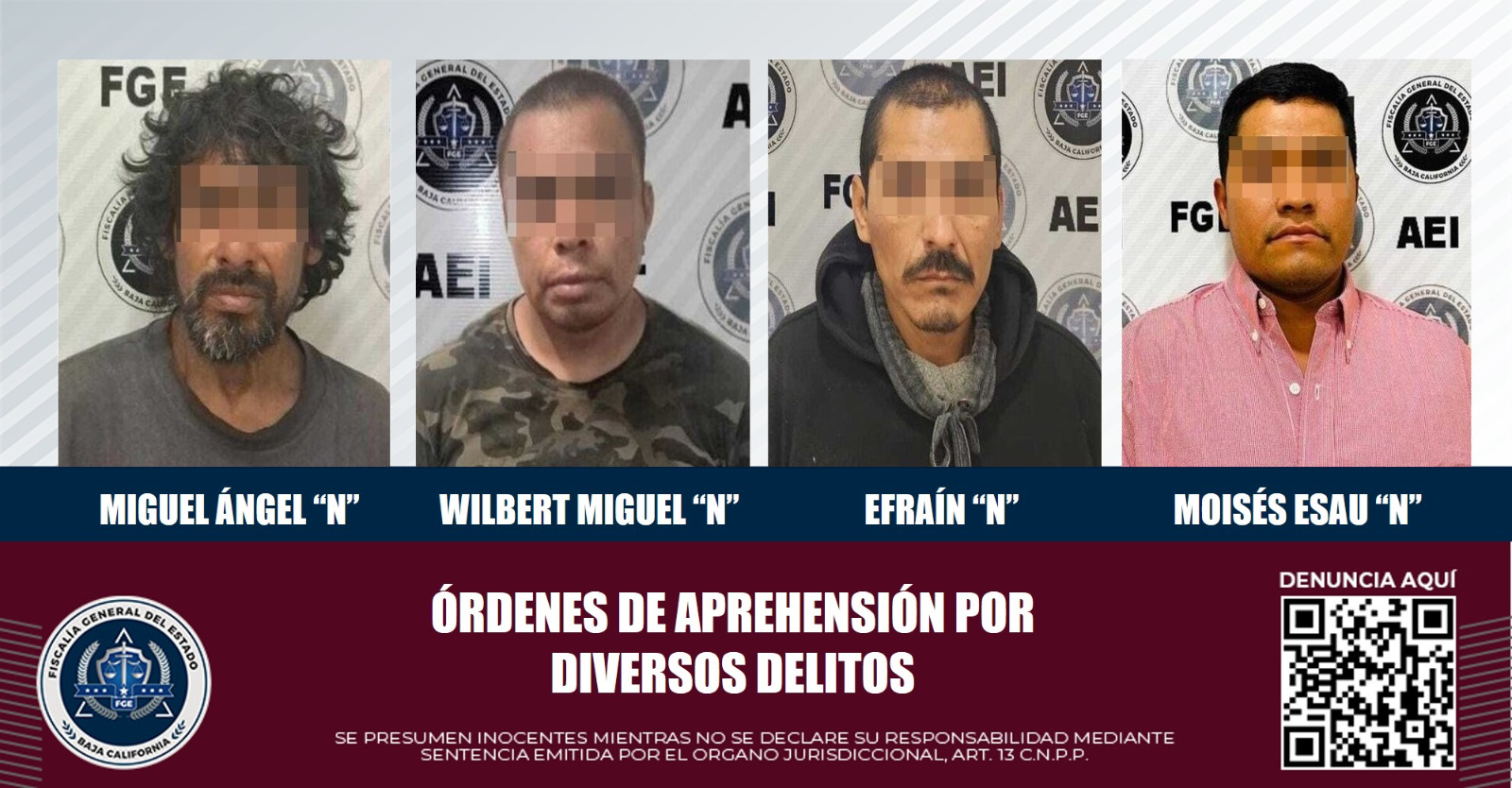 TIJUANA, B.C. Agentes investigadores de la Fiscalía General del Estado (FGE) llevaron a cabo el cumplimiento de cuatro órdenes de aprehensión contra el mismo número de personas, quienes fueron presentadas ante un juez para que respondan por los delitos que se les imputan.