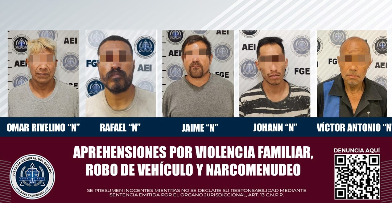 Los hombres detenidos, identificados como Jaime "N", Johann "N", Omar Rivelino "N", Rafael "N" y Víctor Antonio "N", se encuentran vinculados a investigaciones realizadas por la Fiscalía Regional de Tijuana, la Fiscalía Especializada en Narcomenudeo y la Fiscalía Especializada en Delitos Cometidos Contra la Mujer por Razón de Género.
