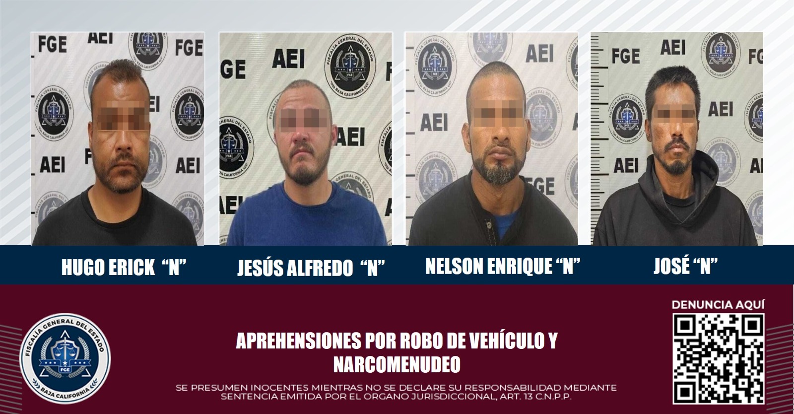 TIJUANA, B.C. Como resultado del trabajo desarrollado en gabinete y campo por parte de elementos de la Agencia Estatal de Investigación de la Fiscalía General del Estado, fueron cumplimentadas cuatro órdenes de aprehensión, tres por robo de vehículo y una por delitos contra la salud.