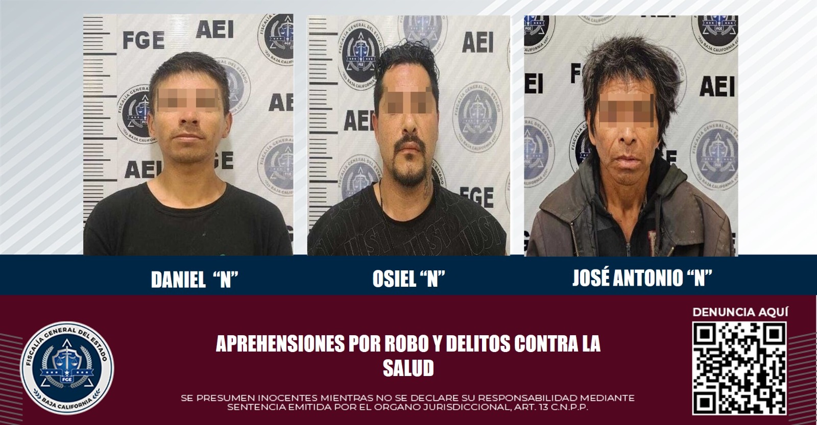 TIJUANA, B.C. El trabajo desarrollado por la Fiscalía General del Estado, permitió que, en acciones distintas, tres hombres fueran aprehendidos, dos de ellos acusados de robo y otro por delitos contra la salud.