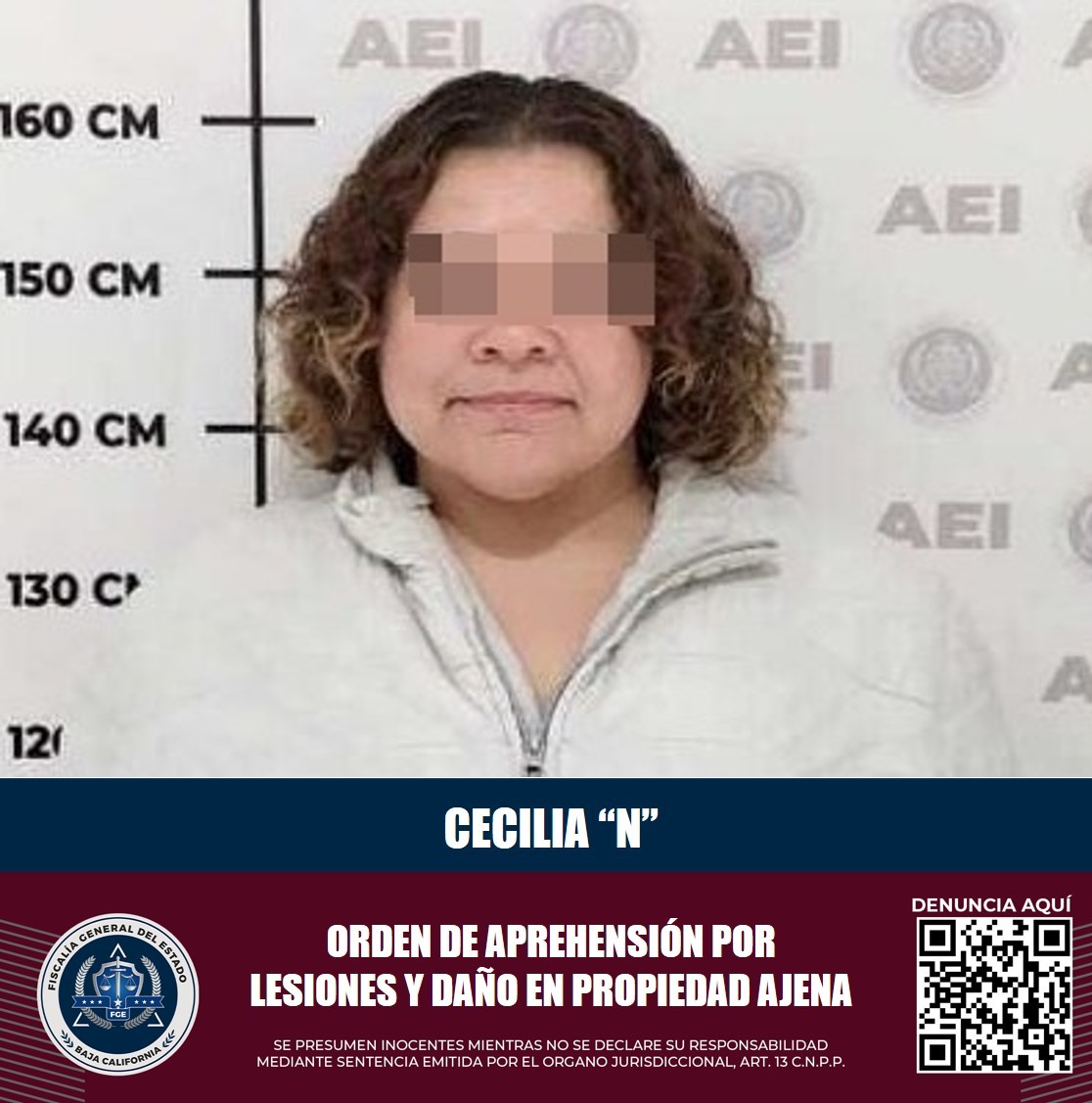 PLAYAS DE ROSARITO, B.C. Como parte de acciones de investigación, la Fiscalía General del Estado (FGE) a través de la Agencia Estatal de Investigación (AEI), cumplimentó una orden de aprehensión que pesaba en contra de una mujer, acusada de lesiones y daño en propiedad ajena.