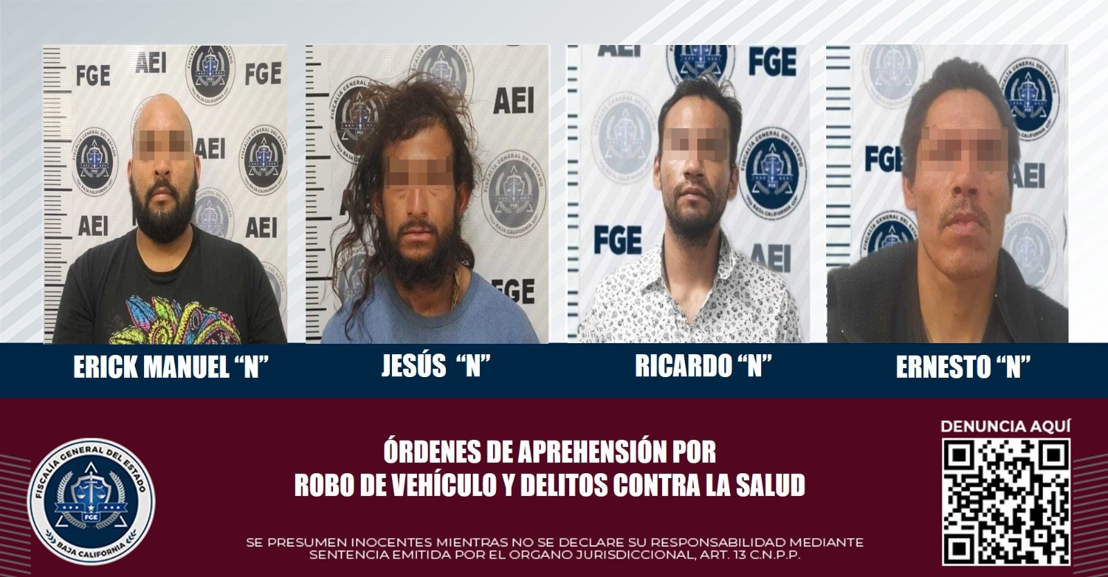 TIJUANA, B.C. El Grupo Especializado de Aprehensiones de la Fiscalía General del Estado, cumplimentó mandamientos judiciales en contra de cuatro hombres, tres de ellos acusados por delitos contra la salud y otro por su presunta comisión en robo de vehículo.