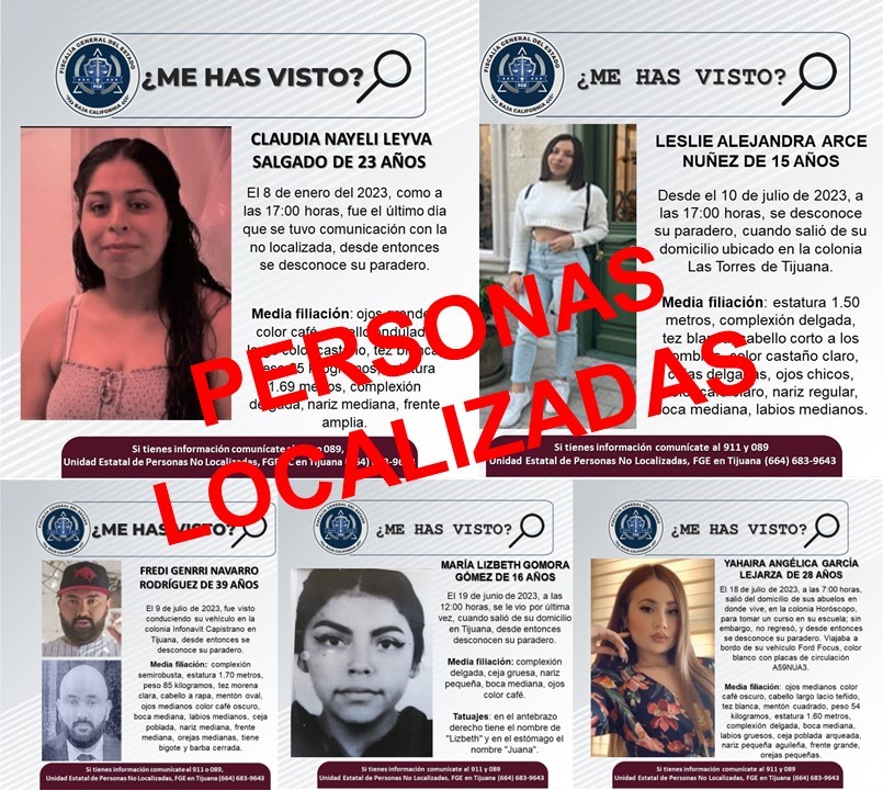 TIJUANA, B.C. Personal de la Fiscalía General del Estado ha logrado ubicar a cinco personas que fueron reportadas como no localizadas. Entre ellas se encuentran cuatro mujeres y un hombre, quienes fueron encontradas en buen estado de salud.