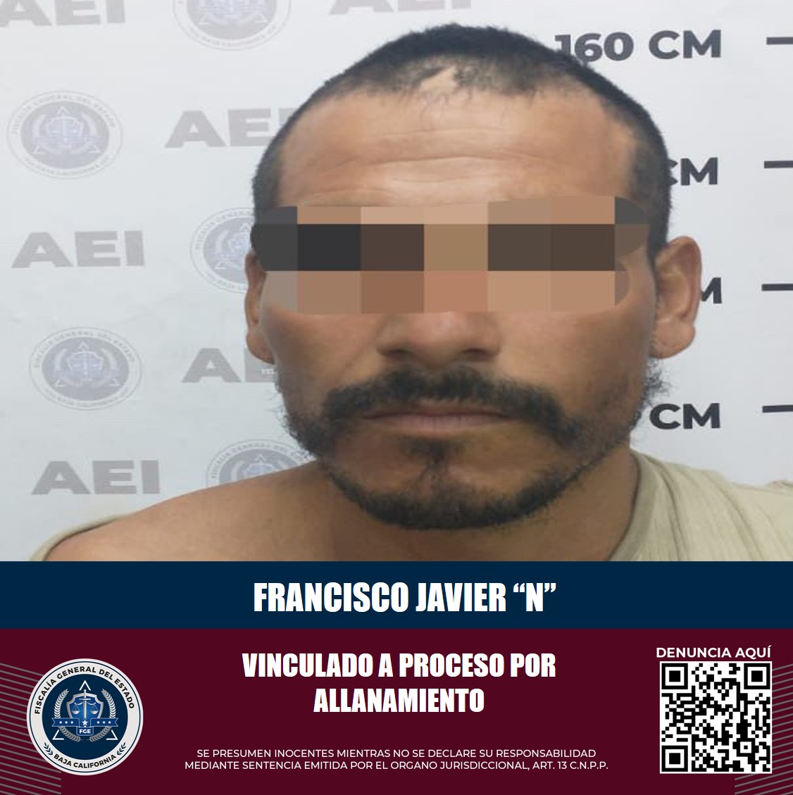 MEXICALI, B.C. La Unidad de Investigación Foránea de Guadalupe Victoria, de la Fiscalía General del Estado (FGE), como resultado del trabajo realizado en la etapa inicial del proceso, obtuvo la vinculación de Francisco Javier “N”, por presuntamente cometer el delito de allanamiento.