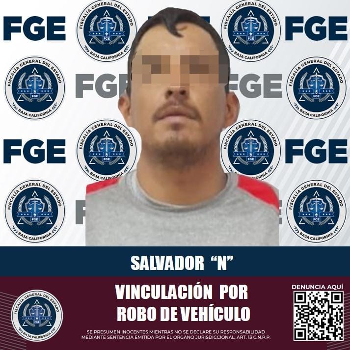 SAN QUINTÍN, B.C. La Fiscalía Regional de San Quintín, obtuvo auto de vinculación a proceso penal contra Salvador “N”, por el delito de robo de vehículo, registrado en colonia Maclovio Rojas.