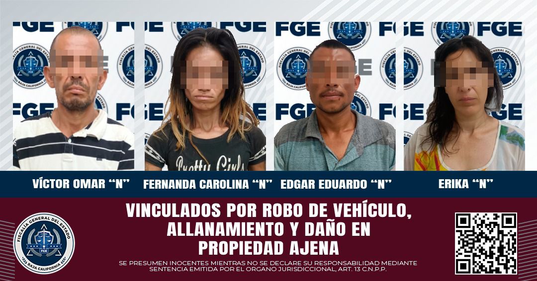 En audiencias celebradas por separado, se logró la vinculación a proceso de dos hombres y dos mujeres por los delitos de robo de vehículo, allanamiento y daño en propiedad ajena, respectivamente. Como medida cautelar, se les impuso prisión preventiva.
