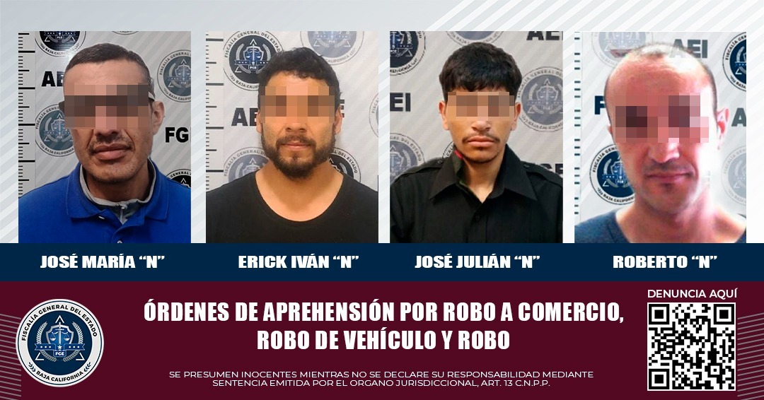 TIJUANA, B.C. La Fiscalía General del Estado informa que cuatro personas con orden de aprehensión fueron capturadas por elementos de la Agencia Estatal de Investigación, debido a su probable relación con delitos de robo a comercio, robo de vehículo, robo y robo calificado.