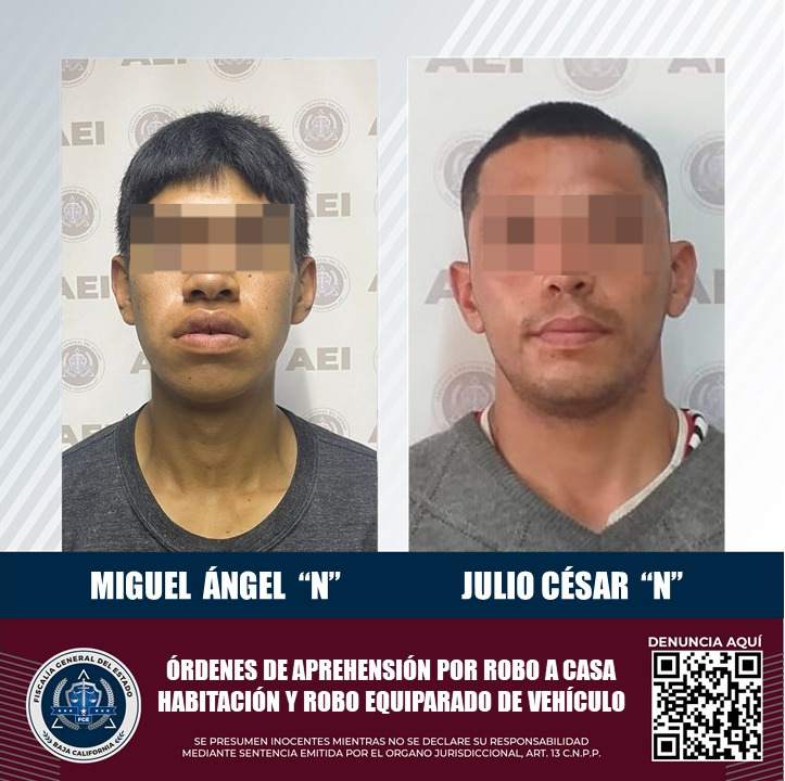 ENSENADA, B.C. La Fiscalía General del Estado, a través de la Agencia Estatal de Investigación, cumplimentó órdenes de aprehensión en contra de dos sujetos por los delitos de robo calificado a casa habitación y robo equiparado de vehículo en modalidad de uso.