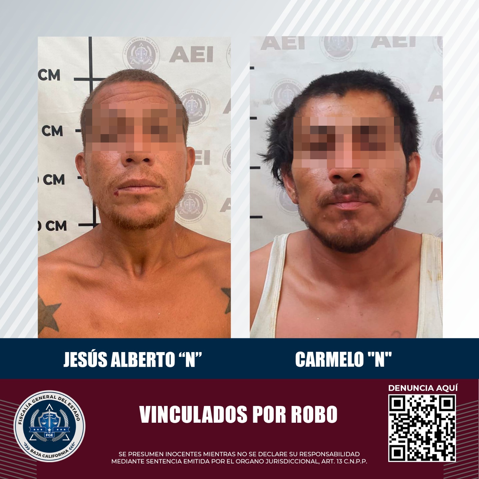 MEXICALI, B.C. La Fiscalía Regional de Mexicali obtuvo la vinculación a proceso de un dos individuos por los delitos de robo con violencia y robo calificado cometido en establecimiento comercial abierto al público, mediante audiencias por separado.