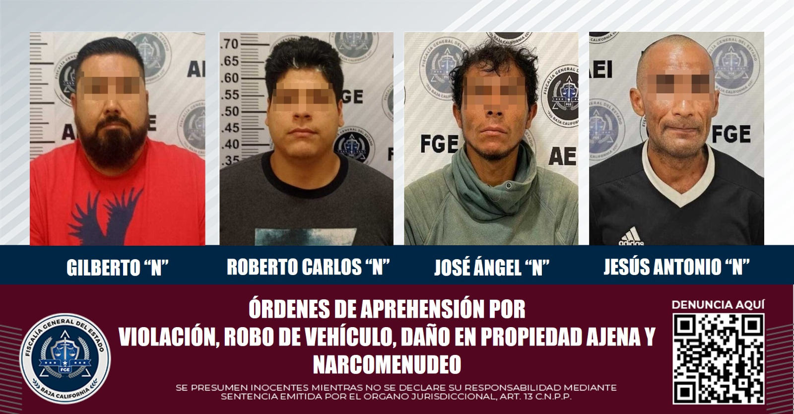 TIJUANA, B.C. Como resultado del trabajo desarrollado en gabinete y campo por parte de elementos de la Agencia Estatal de Investigación (AEI) de la Fiscalía General del Estado, fueron cumplimentadas, el 2 y 3 de agosto, cuatro mandamientos judiciales contra el mismo número de personas, las cuales ya se encuentran a disposición de un juez.