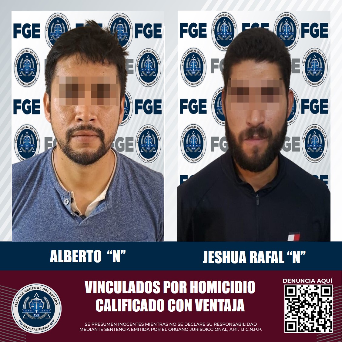 TIJUANA, B.C. La Fiscalía General del Estado, a través del agente del Ministerio Público de la Fiscalía Especializada en Delitos Contra la Vida, presentó ante un juez pruebas contundentes que involucran a Jeshua Rafal “N” y a Alberto “N” en el homicidio de un hombre, cometido el pasado 29 de julio en la colonia Dávila; ambos se encuentran vinculados a proceso y en prisión preventiva.
