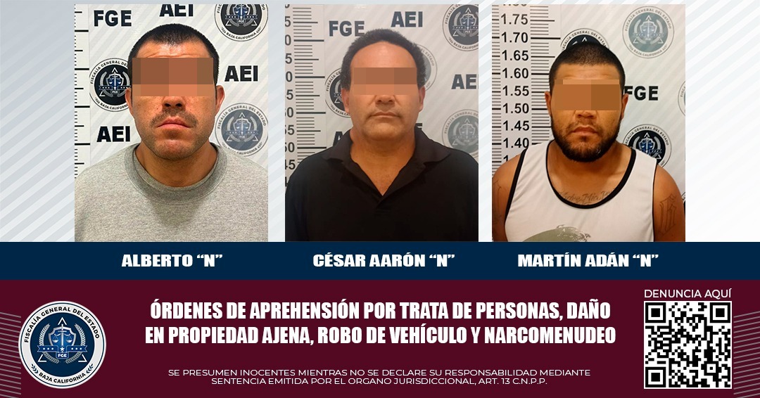 TIJUANA, B.C. La Fiscalía General del Estado, a través de la Unidad de Aprehensiones de la Agencia Estatal de Investigación, logró la detención de tres personas del sexo masculino, quienes en casos diferentes contaban con orden de aprehensión por los delitos de trata de personas, daño en propiedad ajena, robo de vehículo y narcomenudeo.