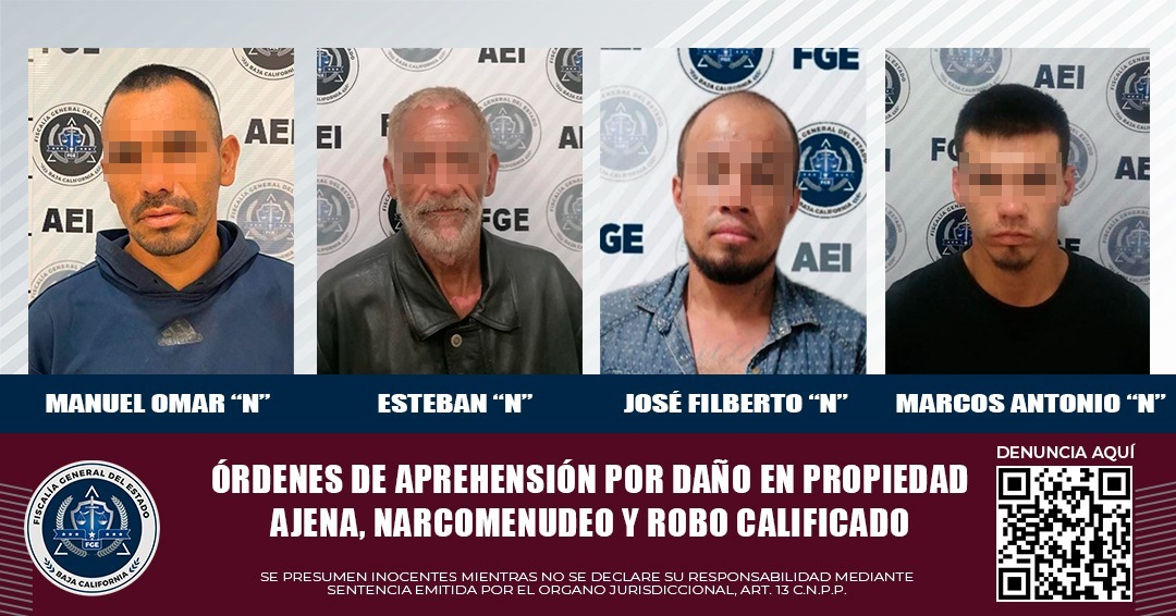 TIJUANA, B.C. Elementos policiacos de la Fiscalía General del Estado cumplimentaron cuatro órdenes de aprehensión, en contra de sujetos acusados, en casos por separado, de los delitos de robo calificado, daño en propiedad ajena y narcomenudeo.