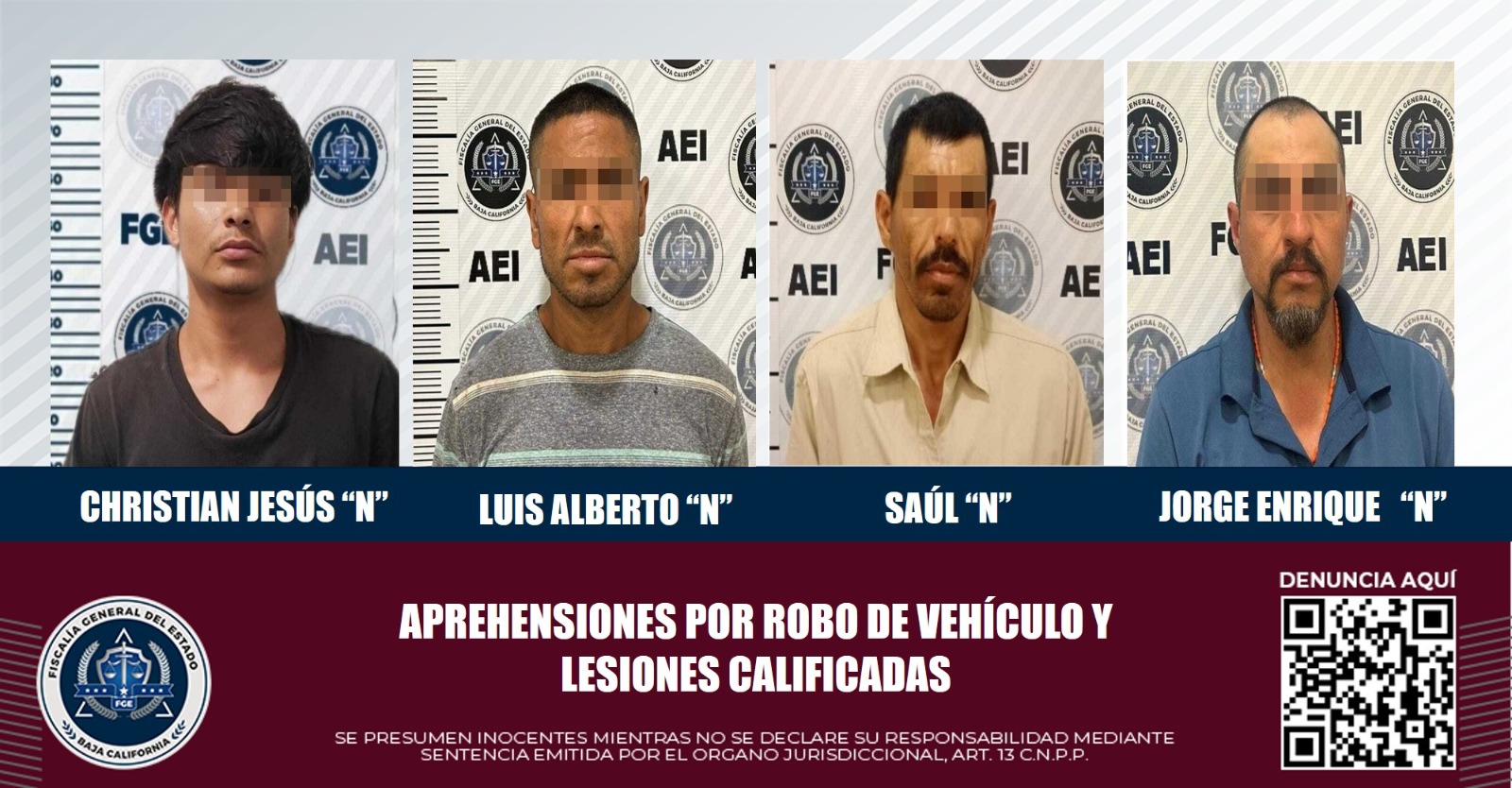 TIJUANA, B.C. La Fiscalía General del Estado, a través de sus acciones encaminadas a la persecución de los delitos comandadas por la Agencia Estatal de Investigación (AEI), logró la cumplimentación de tres mandamientos judiciales por robo de vehículo y uno por lesiones calificadas.