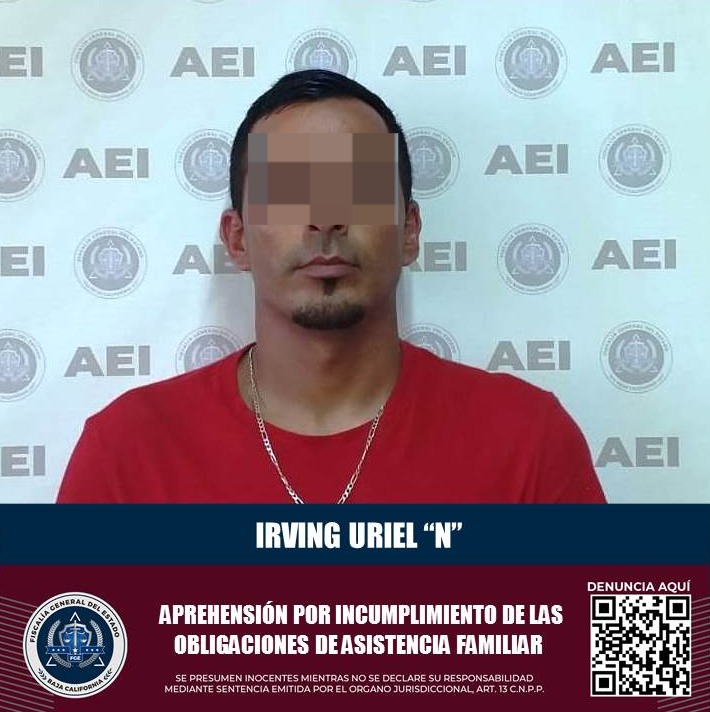 ENSENADA, B.C. Elementos pertenecientes al Grupo Especializado en Aprehensiones, de la Fiscalía General del Estado, capturaron a un hombre identificado como Irving Uriel “N”, a quien se le atribuye el delito de incumplimiento de las obligaciones de asistencia familiar.