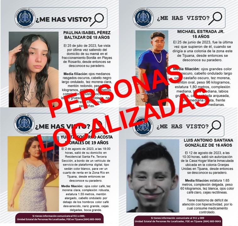 Las personas localizadas son: Paulina Isabel Pérez Baltazar de 18 años, Michael Estrada Jr. de 15 años, Yiritzi Socorro Acosta Morales de 19 años y Luis Antonio Santana González de 16 años de edad.