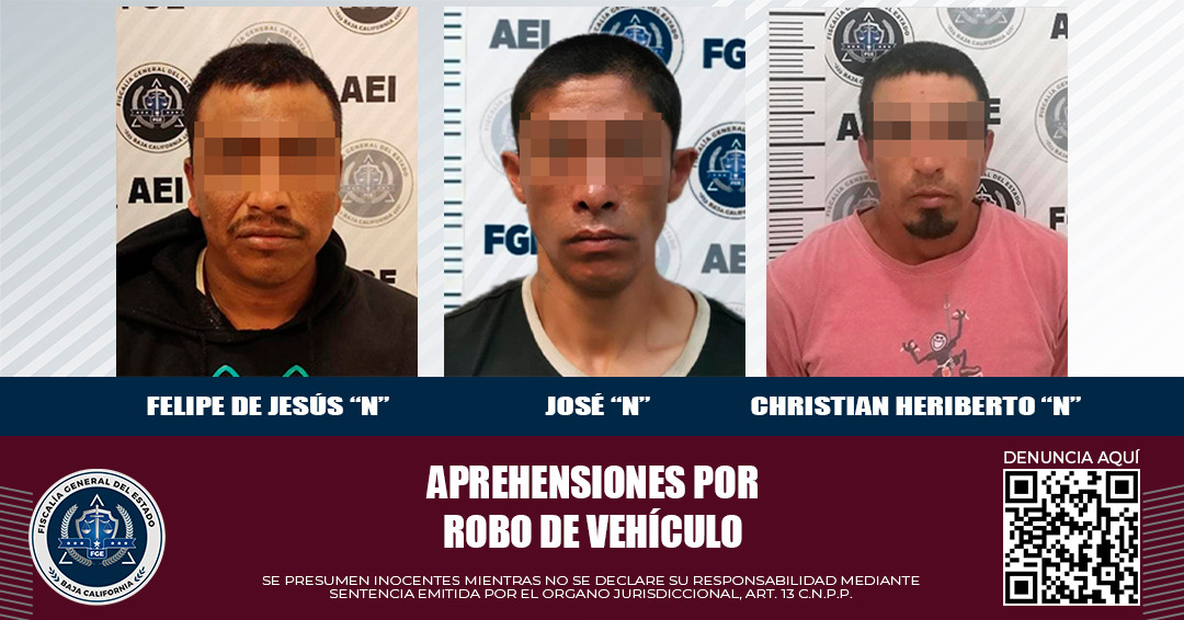 TIJUANA, B.C. Acciones de persecución del delito permitieron a la Fiscalía General de Estado dar cumplimiento a órdenes de aprehensión en contra tres personas, investigadas por robo de vehículo, en casos penales por separado.
