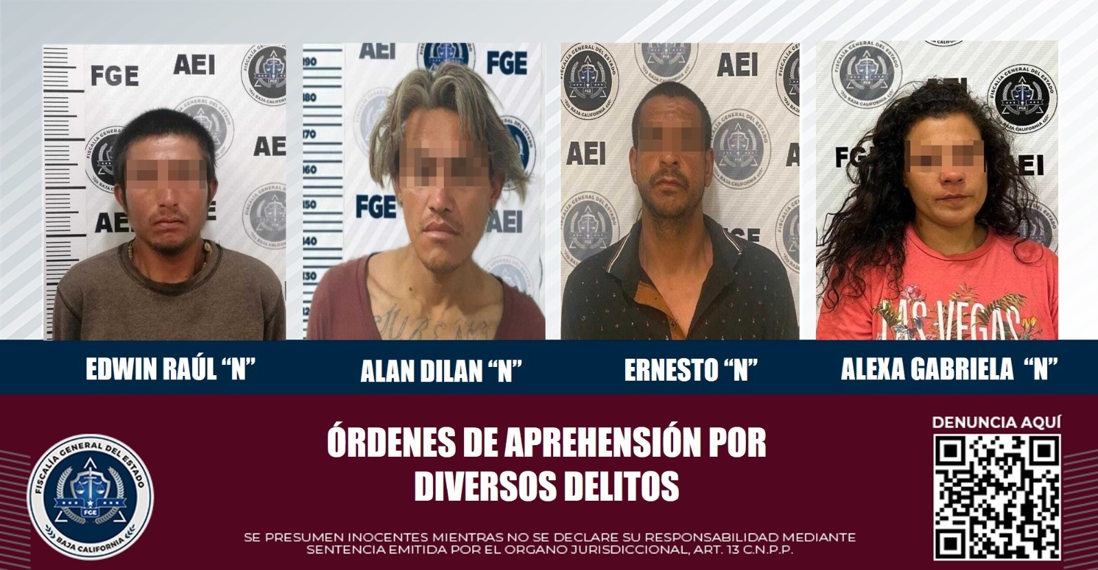 Efectivos de la Agencia Estatal de Investigación (AEI), dieron cumplimiento a las órdenes de aprehensión que pesaban en contra de Edwin Raúl “N”, Alan Dilan “N”, Ernesto “N” y Alexa Gabriela “N”, quienes fueron detenidos en diversas diligencias judiciales realizadas en Tijuana.