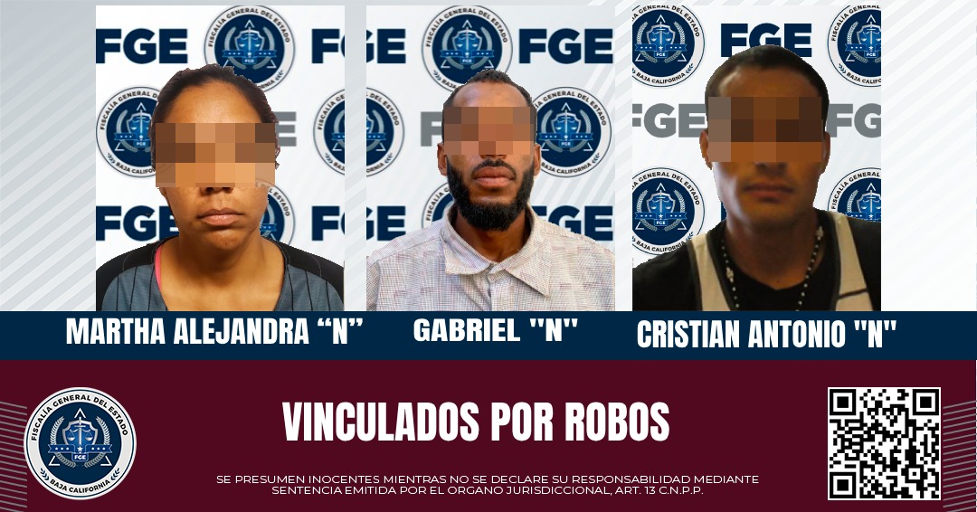 MEXICALI B.C. La Fiscalía Regional de Mexicali, a través de las Unidades de Investigación con Detenidos Poniente y Robos Oriente, logró, mediante elementos de prueba, la vinculación a proceso de dos hombres y una mujer, presuntamente relacionados en robos con violencia.
