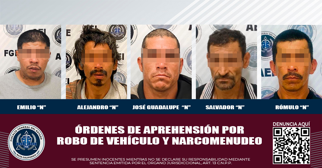 TIJUANA, B.C. La Fiscalía General del Estado, a través de efectivos de la Agencia Estatal de Investigación, logró la detención de cinco personas relacionadas con delitos contra la salud y robo de vehículo, quienes contaban con órdenes de aprehensión en asuntos diversos.