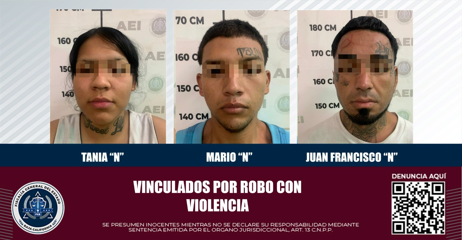 MEXICALI, B.C. La Fiscalía Regional de Mexicali, logró con base en la correcta integración de la carpeta de investigación, la vinculación a proceso de dos hombres y una mujer, presuntamente relacionados en un robo con violencia en establecimiento comercial.