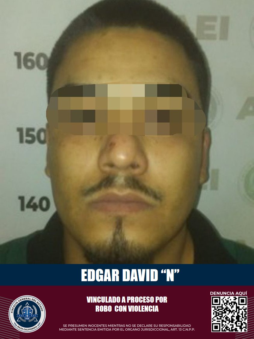 MEXICALI, B.C. La Fiscalía Regional de Mexicali obtuvo la vinculación a proceso de Edgar David “N” por presuntamente cometer el delito de robo con violencia.