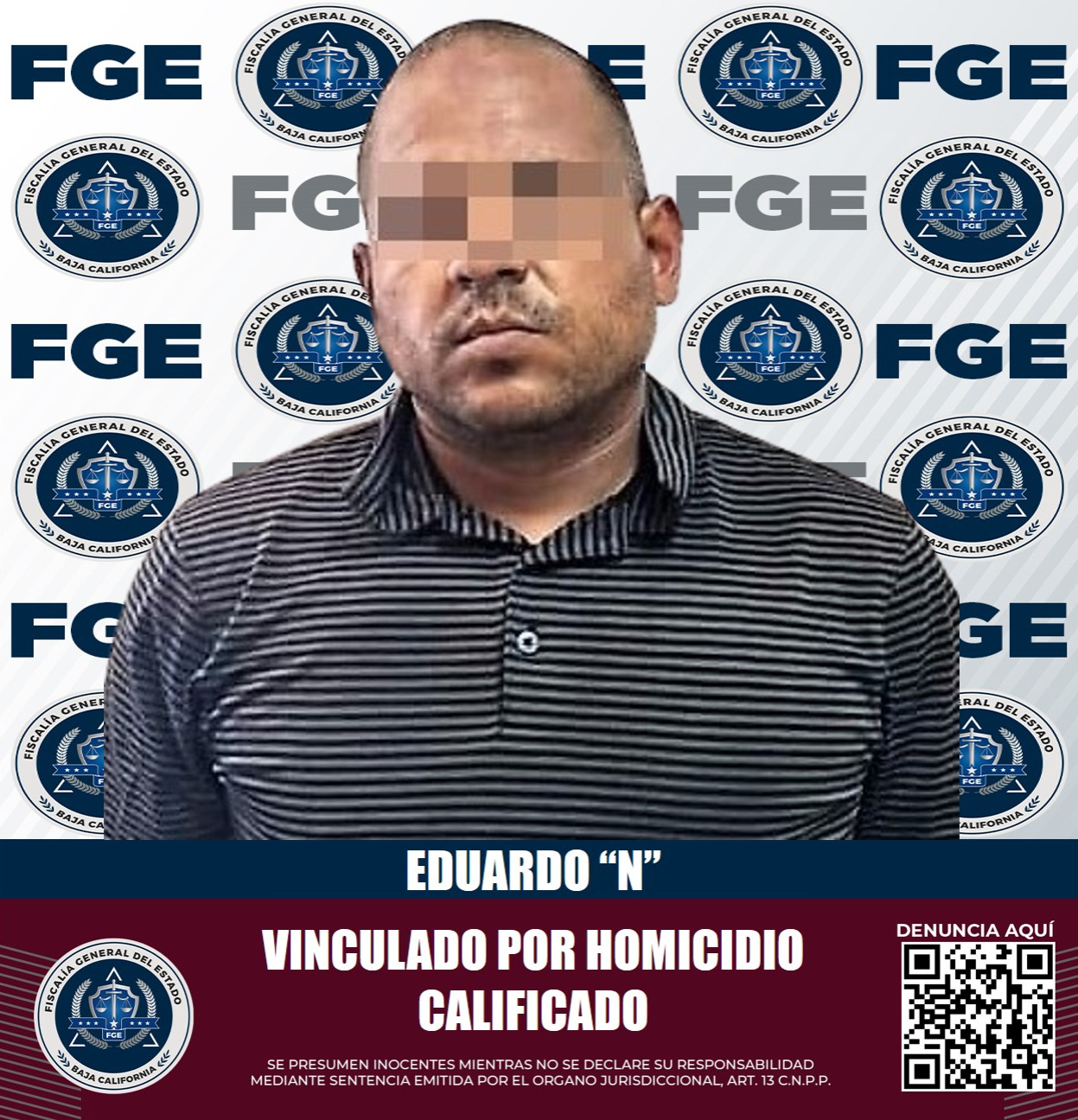 TECATE, B.C. 31 DE AGOSTO DE 2023.- La Fiscalía General del Estado, a través del agente del Ministerio Público de la Fiscalía Especializada en Delitos Contra la Vida, presentó ante un juez los elementos de prueba que involucran a Eduardo "N" en el delito de homicidio calificado. Como resultado, actualmente se encuentra vinculado a proceso y en prisión preventiva.