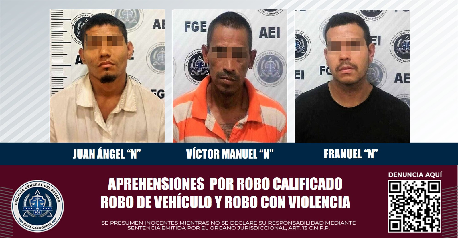 TIJUANA, B.C. Derivado del trabajo realizado por agentes investigadores de la Fiscalía General del Estado (FGE), se logró cumplimentar tres órdenes de aprehensión por los delitos de robo calificado, robo de vehículo y robo con violencia.
