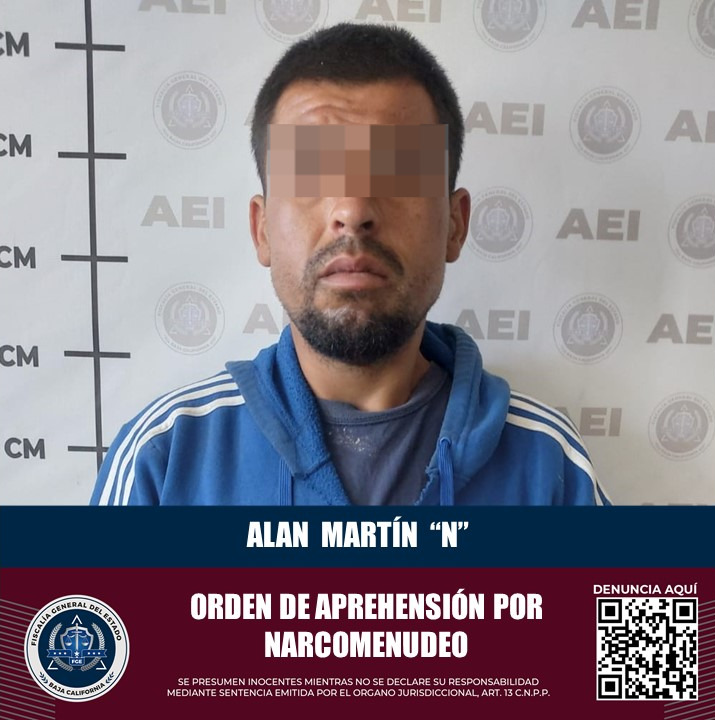 ENSENADA, B.C. Acciones de campo e indagación desplegadas por agentes de la Fiscalía General del Estado resultaron en la captura de Alan Martín “N”, quien fue puesto en prisión, por contar con orden de aprehensión por el delito de narcomenudeo.