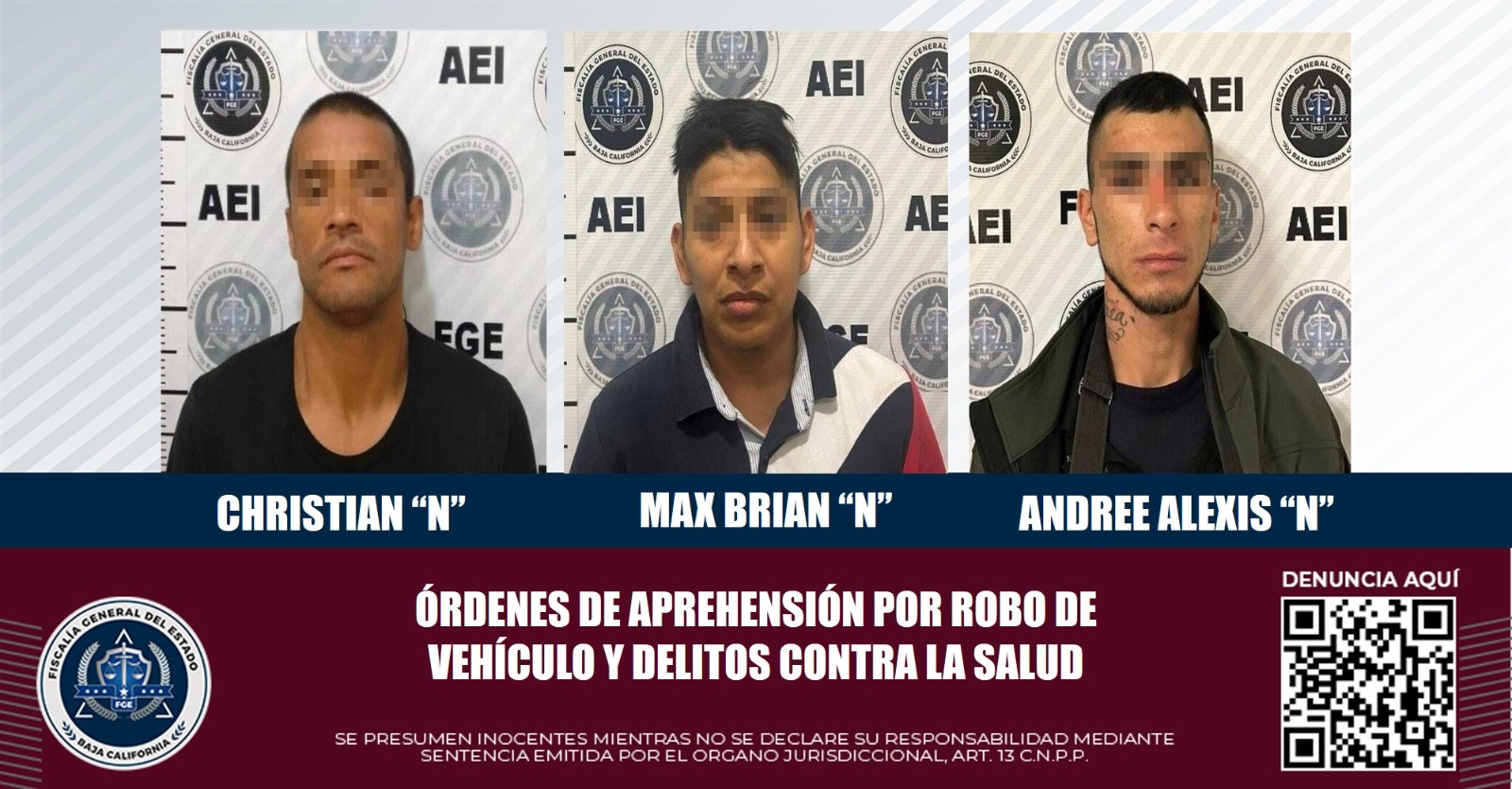 TIJUANA, B.C. Como parte de las labores de persecución de los delitos que es ámbito de competencia de la Fiscalía General del Estado, elementos adscritos a la Agencia Estatal de Investigación (AEI), cumplimentaron tres mandamientos judiciales, previamente autorizados por jueces de control, uno por robo de vehículo y dos por delitos contra la salud.