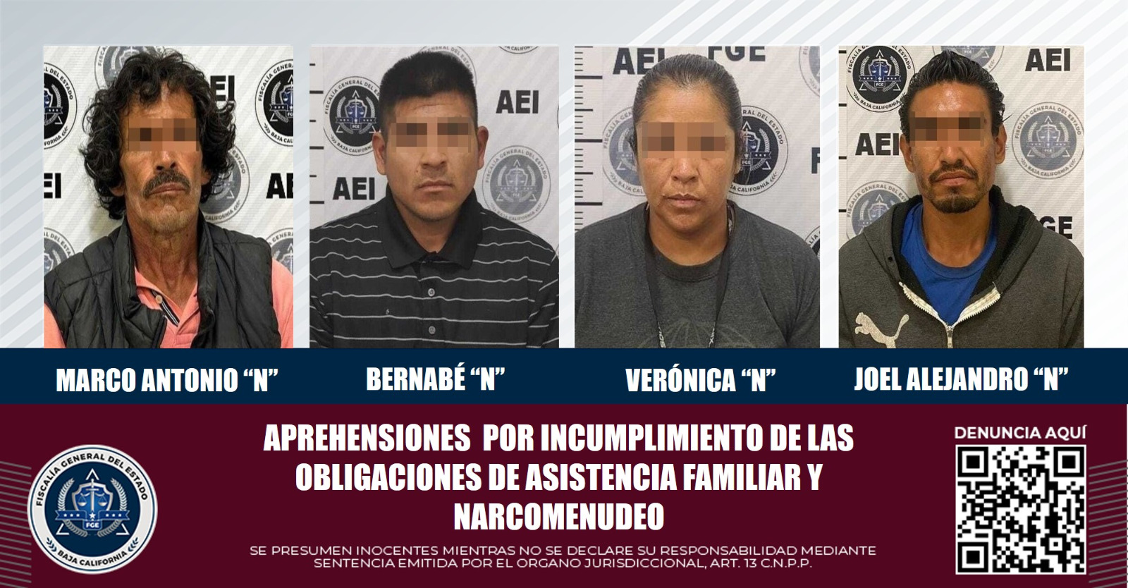 TIJUANA, B.C. Agentes estatales de investigación de la Fiscalía General del Estado (FGE), dieron cumplimiento a mandamientos judiciales en contra de cuatro personas que intentaban evadir la justicia; ya se encuentran a disposición de un juez.