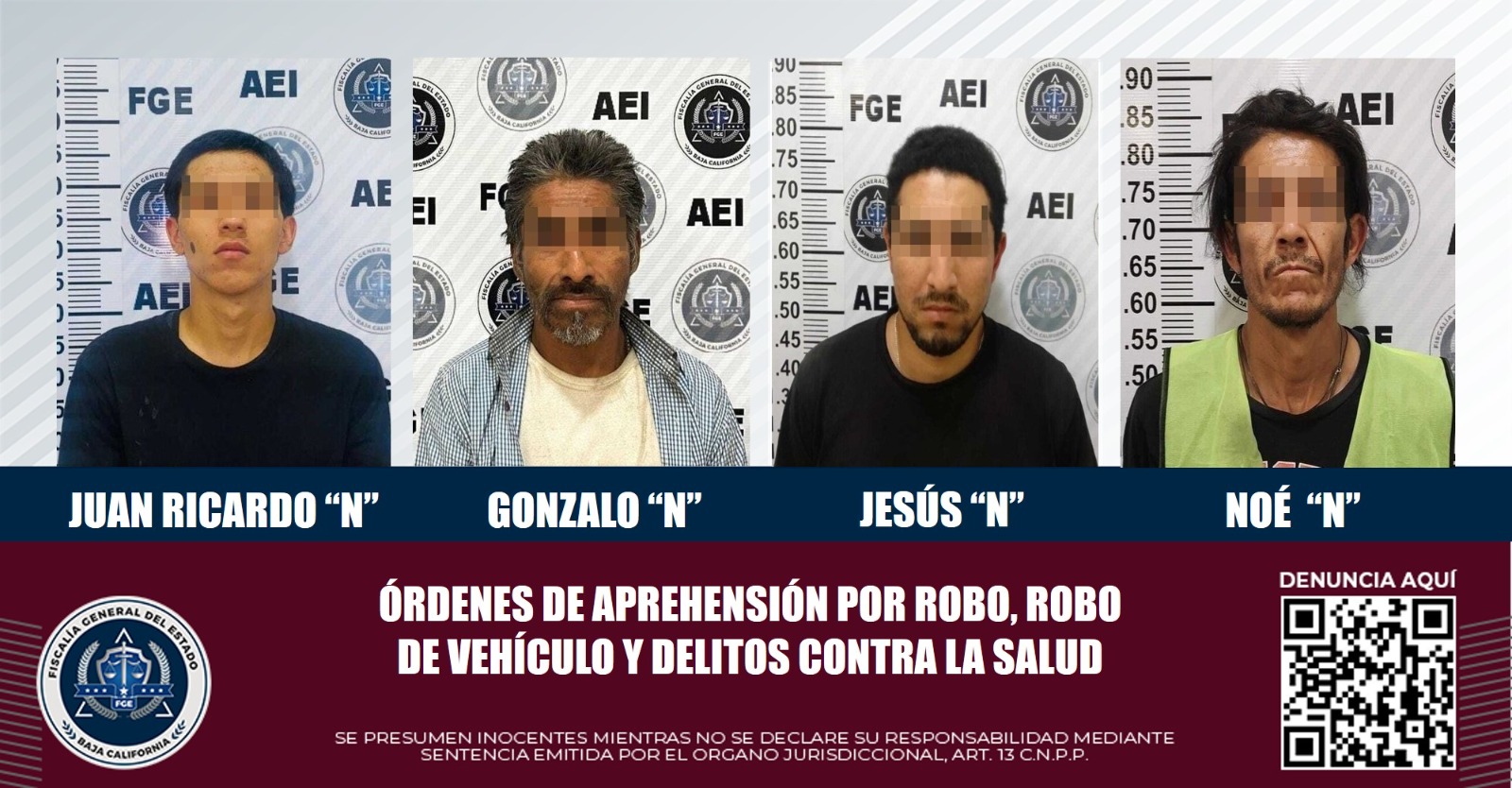 TIJUANA, B.C. El desarrollo de investigaciones por la comisión de delitos, derivó en la cumplimentación de diversas órdenes de aprehensión por robo, robo de vehículo y delitos contra la salud, lo cual fue posible a través de diligencias efectuadas por elementos de la Agencia Estatal de Investigación (AEI) de la Fiscalía General del Estado.